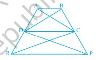 在下图中,ar \( (\mathrm{DRC})= \) ar \( (\mathrm{DPC}) \) 且 ar \( (\mathrm{BDP})=\operatorname{ar}(\mathrm{ARC}) \)。证明四边形\( \mathrm{ABCD} \) 和 \( \mathrm{DCPR} \) 都是梯形。