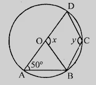 如图所示,O是圆心,∠DAB = 50°。计算x和y的值。