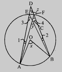 如图所示,$O$ 是圆心,证明 $\angle x = \angle y + \angle z$。