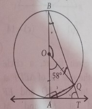 在给定的图形中,\(AB\)是圆的直径,圆心为\(O\),\(AT\)是切线。如果\(∠AOQ=58°\),求\(∠ATQ\)。