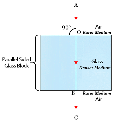 光线从较稠密介质沿垂直于界面的法线方向射入较稀疏介质: