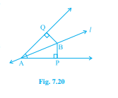 直线 \( l \) 是角 \( \angle A \) 的角平分线,\( B \) 是 \( l \) 上任意一点。BP 和 BQ 分别是 B 到 \( \angle A \) 两边的垂线。证明