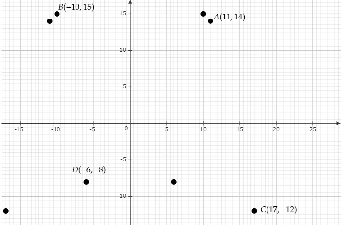 (ii) \( A(11,14), B(-10,15), C(17,-12), D(-6,-8) \) 在\( y \)轴上反射后的像。将所有上述点及其像分别绘制在不同的网格上。