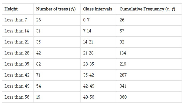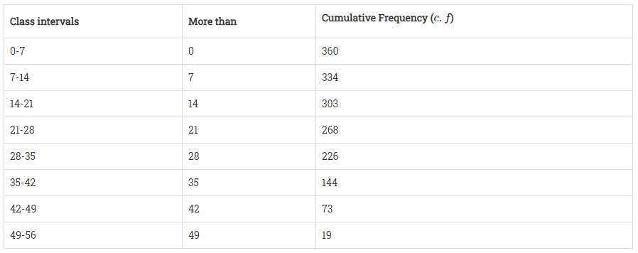 在图表上绘制点(7, 26), (14, 57), (21, 92), (28, 134), (35, 216), (42, 287), (49, 341) 和 (56, 360),并用自由手绘线连接它们,得到如下所示的累积频数曲线。