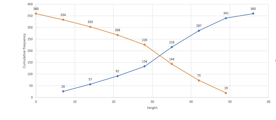 我们必须绘制“小于”累积频数曲线和“大于”累积频数曲线。