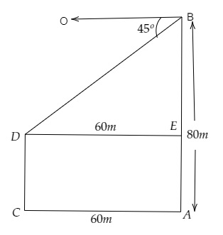$AC=DE= 60\ m$ 且 $AE=CD=h$ 以及 $BE = 80-h\ m$