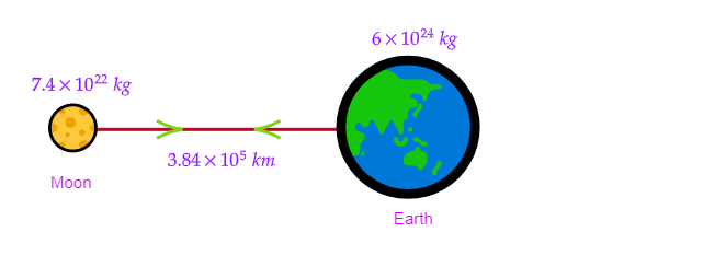 地球和月球之间的距离 $( r)=3.84\times 10^5\ km= 3.84\times 10^8\ m$