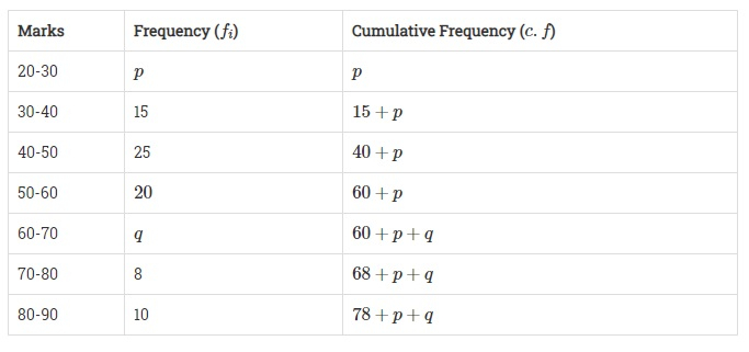 以下数据的中位数是 50。如果所有频数之和为 90,求 p 和 q 的值。