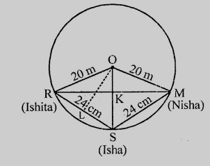 三个女孩伊希塔、伊莎和尼莎在一个公园里,站在半径为 20 米的圆圈上玩游戏。伊希塔把球扔给伊莎,伊莎扔给尼莎,尼莎扔给伊希塔。如果伊希塔和伊莎之间以及伊莎和尼莎之间的距离各为 24 米,那么伊希塔和尼莎之间的距离是多少?