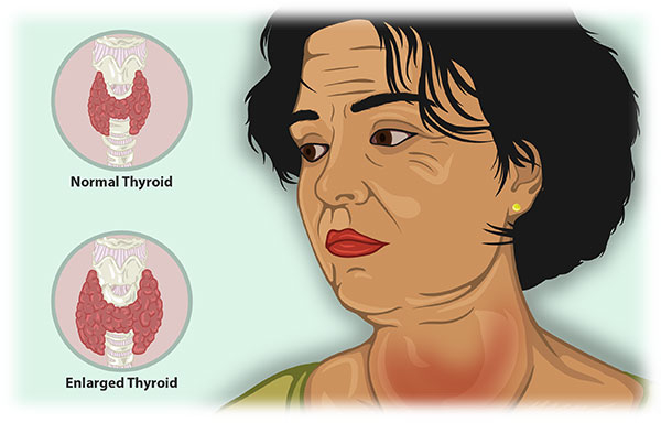 由于甲状腺不能获得足够的碘,因此会逐渐肿大形成甲状腺肿,这是因为它在尽力满足对甲状腺激素产生的需求。在世界范围内,碘缺乏是导致甲状腺肿大甲状腺肿的原因中最常见的原因。