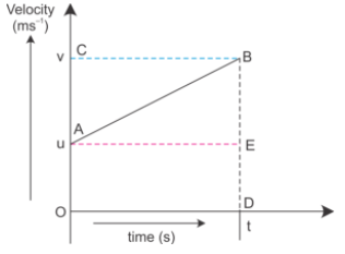 考虑一个具有初始速度u的物体的线性运动。假设物体均匀加速,并在时间t后获得最终速度v。速度-时间图是一条直线AB,如下所示。