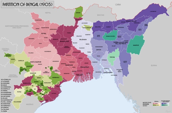 孟加拉省份划分于1905年克尔宗勋爵担任印度总督时宣布。这次划分的官方理由是行政效率。孟加拉地区面积广阔,包括今天的西孟加拉邦、比哈尔邦、奥里萨邦、孟加拉国和阿萨姆邦。