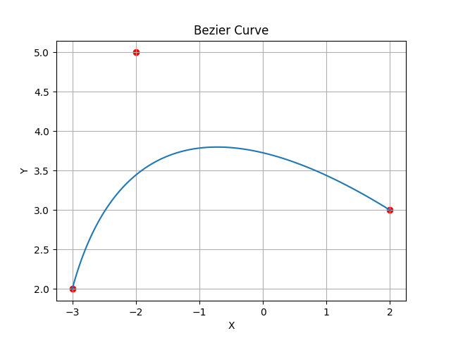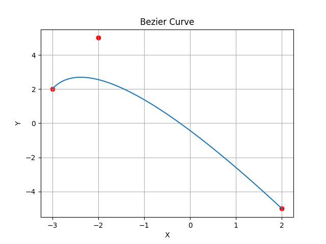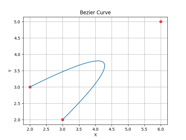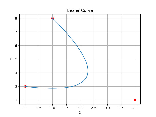 在此代码中,我们使用 matplotlib 和 numpy 生成了一个贝塞尔曲线。我们使用的方法定义并绘制了贝塞尔曲线上起始的点。输出将显示起始点、控制点和结束点。