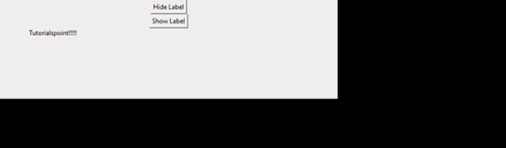 import tkinter as tk def hide_label(): label.place_forget() def show_label(): label.place(x=50, y=50) # Create a Tkinter window window = tk.Tk() # Create a label widget label = tk.Label(window, text="Tutorialspoint!!!!!") # Add a button to hide the label hide_button = tk.Button(window, text="Hide Label", command=hide_label) hide_button.pack() # Add a button to show the label show_button = tk.Button(window, text="Show Label", command=show_label) show_button.pack() # Display the label initially label.place(x=50, y=50) # Run the Tkinter event loop window.mainloop()