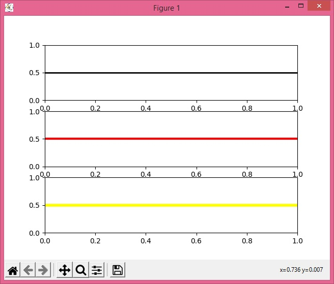 from matplotlib import pyplot as plt fig, (ax1, ax2, ax3) = plt.subplots(3) plt.rcParams["figure.figsize"] = [7.00, 3.50] plt.rcParams["figure.autolayout"] = True ax1.axhline(y=0.5, xmin=0, xmax=3, c="black", linewidth=2, zorder=0) ax2.axhline(y=0.5, xmin=0, xmax=3, c="red", linewidth=3, zorder=0) ax3.axhline(y=0.5, xmin=0, xmax=3, c="yellow", linewidth=4, zorder=0) plt.show()