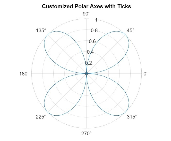 % MATLAB code to change R-tick angle % Create a polar axis ax = polaraxes; % Create data for polar plot t = linspace(0, 2*pi, 100); r = sin(2*t); % Create a polar plot of the data polarplot(ax, t, r); % Change the R-tick angle rtickangle(ax, 270); % Rotating R-tick to 270°
