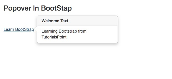 <a href="#" data-toggle="popover" title="Welcome Text" data-content="Learning Bootstrap from TutorialsPoint!">Learn BootStrap</a>