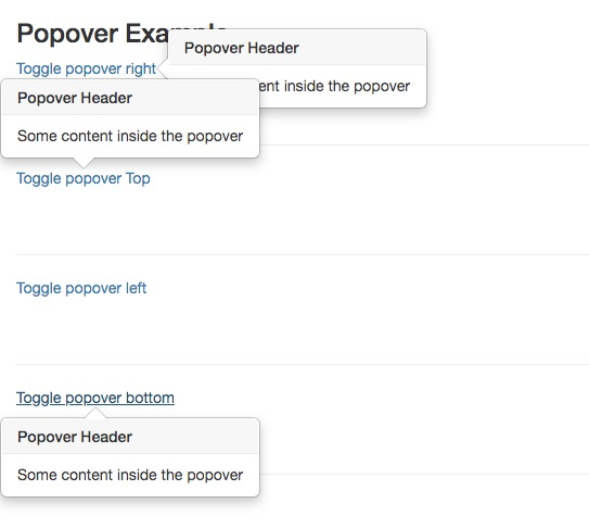 <a href="#" data-toggle="popover" title="Popover Header" data-placement="right" data-content="Some content inside the popover">Toggle popover right</a><br><br><br><hr>