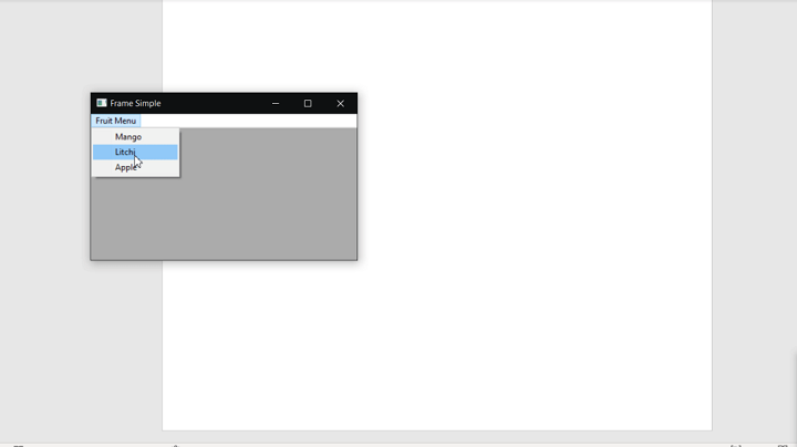 在上面的程序中,我们使用菜单栏创建一个框架。当您单击框架时,将显示一个弹出菜单。在菜单栏中,它将有一个水果项目的弹出菜单,例如“芒果”、“荔枝”、“苹果”。当您单击或选择菜单栏中列出的任何项目时,它将显示一个包含所选水果项目名称的消息作为操作。