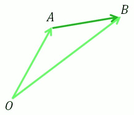 物体的坐标对于计算位置向量是必要的。设 A 的位置向量为 (x_1,y_1,z_1),B 的位置向量为 (x_2,y_2,z_2)。物体在点 A 的位置向量为 OA。类似地,B 相对于原点的位置向量为 OB。位置向量 OA 和 OB 分别记为 x_1 i+y_1 j+z_1 k 和 x_2 i+y_2 j+z_2 k。A 相对于 B 的位置向量由下式给出:
