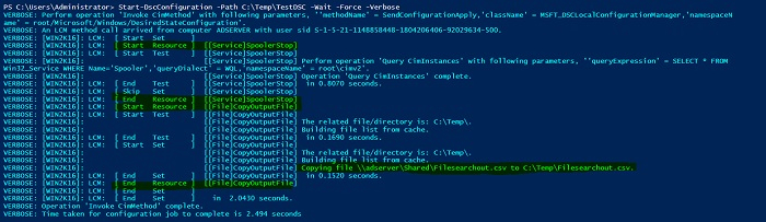 PS C:\Users\Administrator> Test-DscConfiguration -ComputerName Win2k16 True