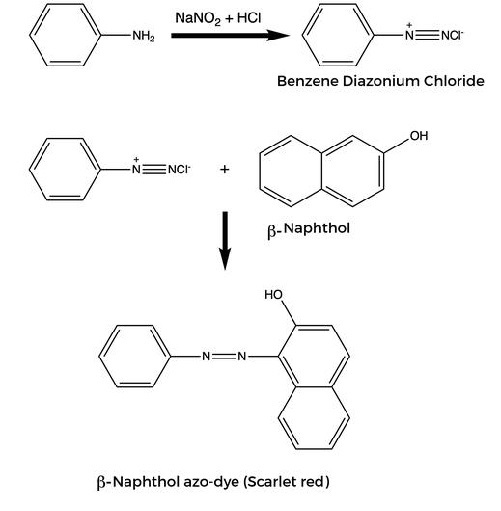 当亚硝酸酐与苯胺”反应时,会生成硝基胺衍生物。然而,硝基胺衍生物本质上不稳定,并异构化为形成二乙酸。它有助于转化为重氮盐。在氢氧化钠的存在下,重氮盐与 2-萘酚反应,结果产生 2-萘酚苯胺,这是一种苯胺染料。