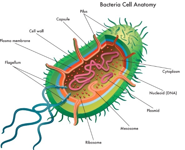 细菌是仅含有一个细胞的原核生物。细菌细胞的内部结构比较简单。它缺少线粒体、溶酶体、高尔基体、内质网、叶绿体、过氧化物酶体、乙醛酸循环体和真正的液泡。此外,细菌缺乏真正的细胞核和核仁,它们是膜结合的。细菌的核称为核区。