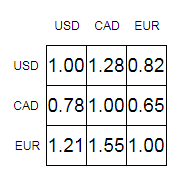 matrix = [ [1, 1.28, 0.82], [0.78, 1, 0.65], [1.21, 1.55, 1] ]