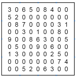 {0, 0, 5, 2, 0, 6, 3, 0, 0}};