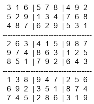 3 1 6 | 5 7 8 | 4 9 2 5 2 9 | 1 3 4 | 7 6 8 4 8 7 | 6 2 9 | 5 3 1 --------------------------- 2 6 3 | 4 1 5 | 9 8 7 9 7 4 | 8 6 3 | 1 2 5 8 5 1 | 7 9 2 | 6 4 3 --------------------------- 1 3 8 | 9 4 7 | 2 5 6 6 9 2 | 3 5 1 | 8 7 4 7 4 5 | 2 8 6 | 3 1 9