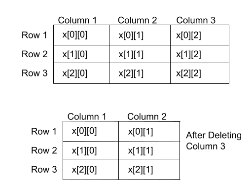 Before Deletion: [['Cyan' 'Red' 'Black'] ['Peach' 'Blue' 'Pink'] ['Green' 'White' 'Grey']] After Deletion [['Cyan' 'Black'] ['Peach' 'Pink'] ['Green' 'Grey']]