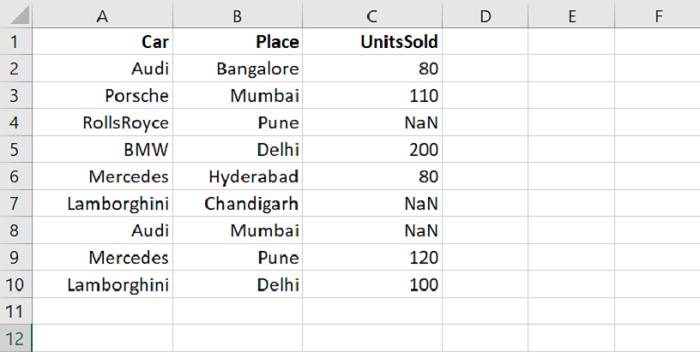 DataFrame... Car Place UnitsSold 0 Audi Bangalore 80.0 1 Porsche Mumbai 110.0 2 RollsRoyce Pune NaN 3 BMW Delhi 200.0 4 Mercedes Hyderabad 80.0 5 Lamborghini Chandigarh NaN 6 Audi Mumbai NaN 7 Mercedes Pune 120.0 8 Lamborghini Delhi 100.0 Number of rows and column in our DataFrame = (9, 3) DataFrame displaying False for Null values = Car Place UnitsSold 0 True True True 1 True True True 2 True True False 3 True True True 4 True True True 5 True True False 6 True True False 7 True True True 8 True True True DataFrame after removing null values... Car Place UnitsSold 0 Audi Bangalore 80.0 1 Porsche Mumbai 110.0 3 BMW Delhi 200.0 4 Mercedes Hyderabad 80.0 7 Mercedes Pune 120.0 8 Lamborghini Delhi 100.0 (Updated)Number of rows and column in our DataFrame = (6, 3)