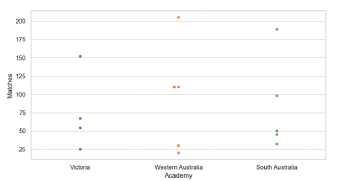 sb.swarmplot(x = "Academy", y = "Matches", order = ["Victoria", "Western Australia", "South Australia"],