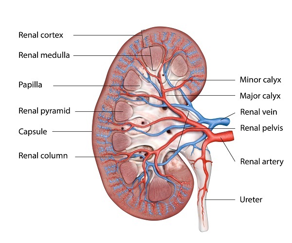肾脏是人体泌尿系统的主要器官。它位于脊柱两侧,肋骨下方。每个人的身体都有两个肾脏,它们是略带红色和棕色的豆形器官。每个肾脏的长度至少为 4 到 5 英寸。
