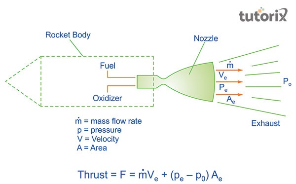 火箭发动机中储存的氧化剂和燃料在燃烧室中点燃。这种燃烧产生大量高温高压的废气。这种热废气通过喷嘴,有助于加速气流(Hashim、Karmakar & Roy,2019)。推力通常是根据牛顿的第三运动定律产生的。
