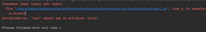 我们在进行测试时可能会遇到 Selenium webdriver 错误:AttributeError:'list' 对象没有属性 'click'。让我们看一个我们遇到此类错误的代码示例。