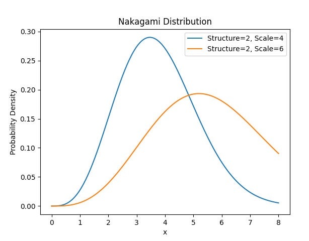 prob_den_fun1 = nakagami.pdf(x, structure1, scale=scale1) prob_den_fun2 = nakagami.pdf(x, structure2, scale=scale2)