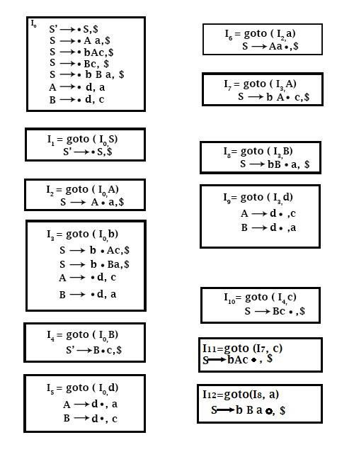 步骤2 - 查找闭包和 goto。构造 LR(1) 项目集。这里所有框都表示新状态。