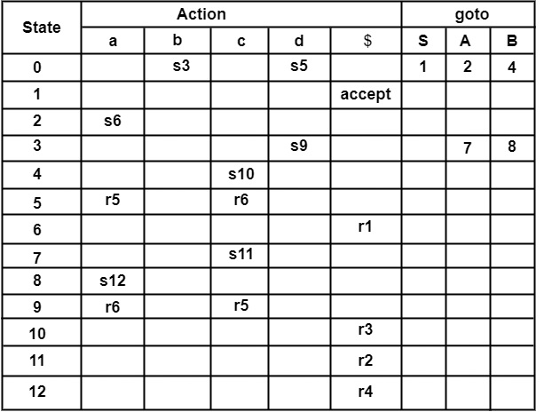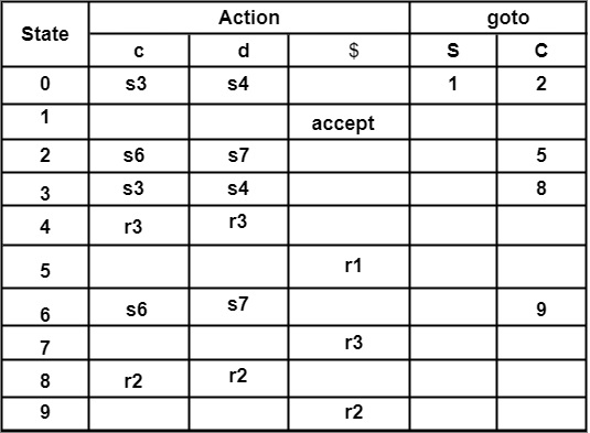 这里,C → d ∙, c | d 具有 A → α ∙ , a 的形式。因此,将 Action[4, c] 和 Action[4, d] 设置为 r3。