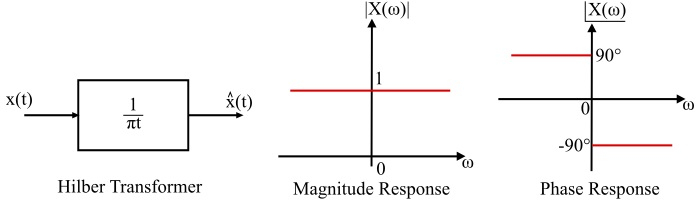这个表达式表明,信号 x(t) 的希尔伯特变换 $\hat{x}(t)$ 可以通过使 x(t) 通过一个传递函数为 [-j\:sgn(ω)] 的线性器件来获得。这个线性器件可以被认为是为输入信号的所有正频率产生 (-90°) 相移,为所有负频率产生 (+90°) 相移的器件。
