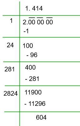 根据勾股定理,在边长为一个单位的正方形中,对角线的长度在几何上等于2的平方根。这可能是发现的第一个无理数。由于它的小数位数无限且无法表示为分数,因此根2是一个无理数。因此,无法计算根2的精确值。