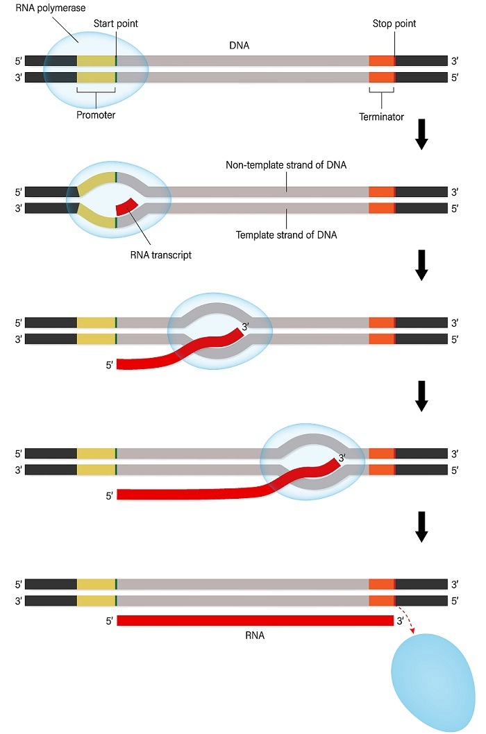 随着RNA聚合酶沿着DNA移动,双螺旋结构在其后重新形成,在酶前方形成新的解开的DNA片段。