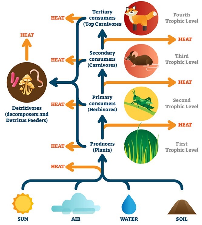 正如观察到的那样,生产者、消费者和分解者形成了养分循环运动。生产者制造养分,当消费者食用生产者时,养分传递给消费者。当分解者食用尸体时,养分传递给分解者,然后再次将养分传递回土壤。