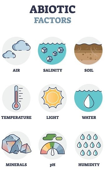 与生物因素不同,非生物因素在一个生态系统到另一个生态系统之间可能会有所不同。例如,在水生环境中,非生物因素可能包括水的pH值、水深、阳光、浊度、盐度、可用养分和溶解氧。在陆地生态系统中,非生物因素可能包括土壤、温度、土壤类型、降雨、海拔、风、养分、阳光等。