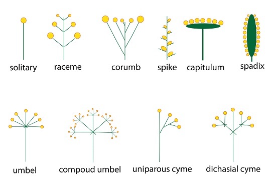花序主要分为三种类型:无限花序、有限花序和一种特殊类型的花序。所有这些类型都细分为不同的子类型,以便更好地理解它们。无限花序又分为四个不同的部分。