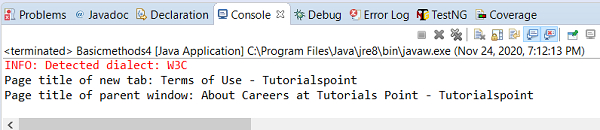 driver.findElement(By.xpath("//*[text()='Terms of Use']")). sendKeys(clickl);然后将所有打开的窗口 ID 保存在 ArrayList 中,并使用 **switchTo** 方法将驱动程序焦点切换到新标签页。然后将新标签页的窗口 ID 作为参数传递给该方法。