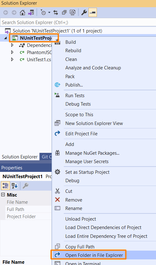 在解决方案资源管理器中右键单击项目。然后单击在文件资源管理器中打开文件夹。