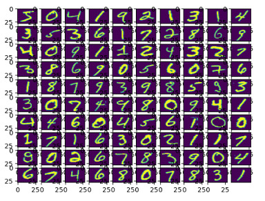 我们创建一个 10x10 的网格,并初始化一个指针来跟踪图像索引。我们使用循环遍历网格。对于每个网格框,我们显示来自训练集的图像,该图像将图像从一维数组重新整形为具有 28x28 维度的二维数组。