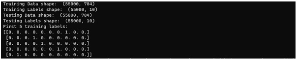 在前面的示例中,我们加载了未进行独热编码的 MNIST 数据。在下面的示例中,我们将打印应用独热编码后训练和测试标签的形状,并打印训练标签的前五行。