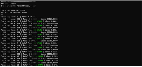 在下面的程序中,使用 MNIST 数据集来训练和测试我们的模型。TfLearn 默认在其软件包中提供 MNIST 数据集。因此,我们可以使用它。